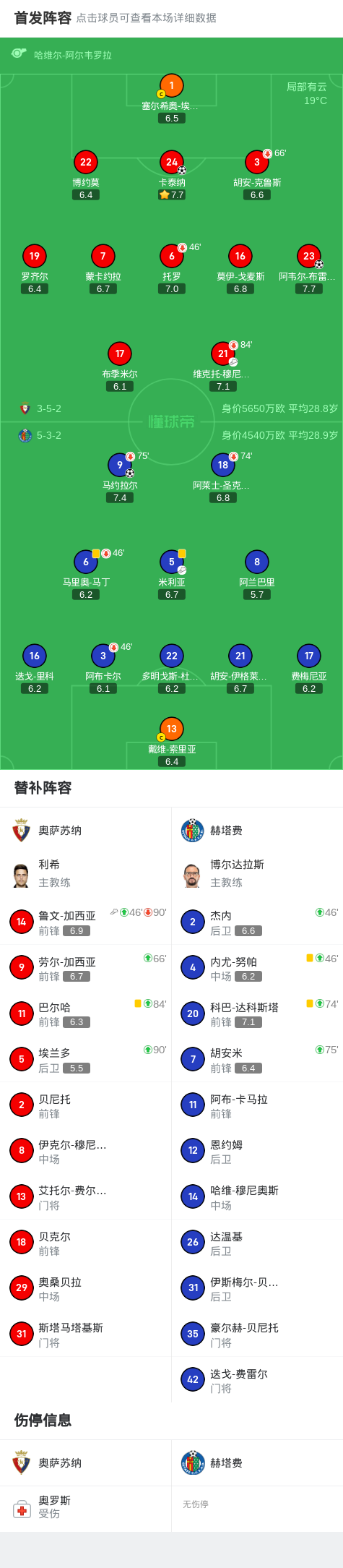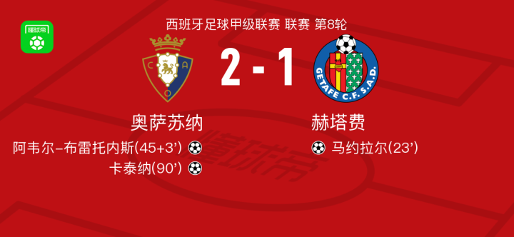 奥萨苏纳2-1逆转赫塔费,卡泰纳、阿韦尔-布雷托内斯破门